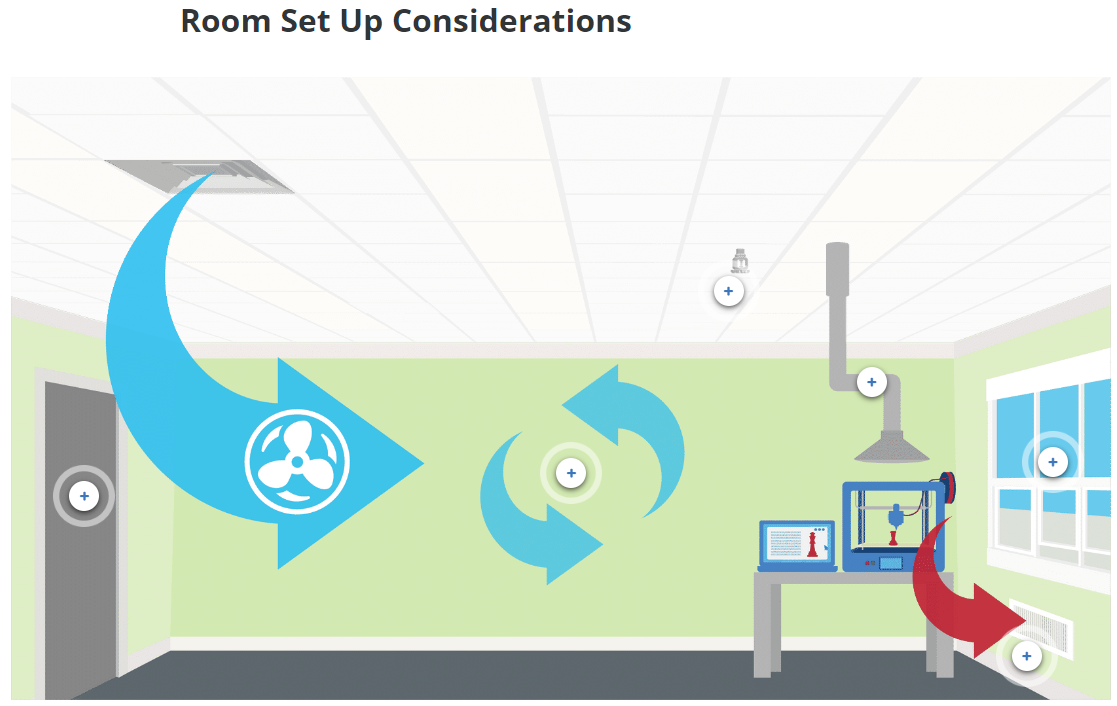 view of a room with 3D printer showing the ways to ventilate the space with local exhaust, fans, windows, and doors.