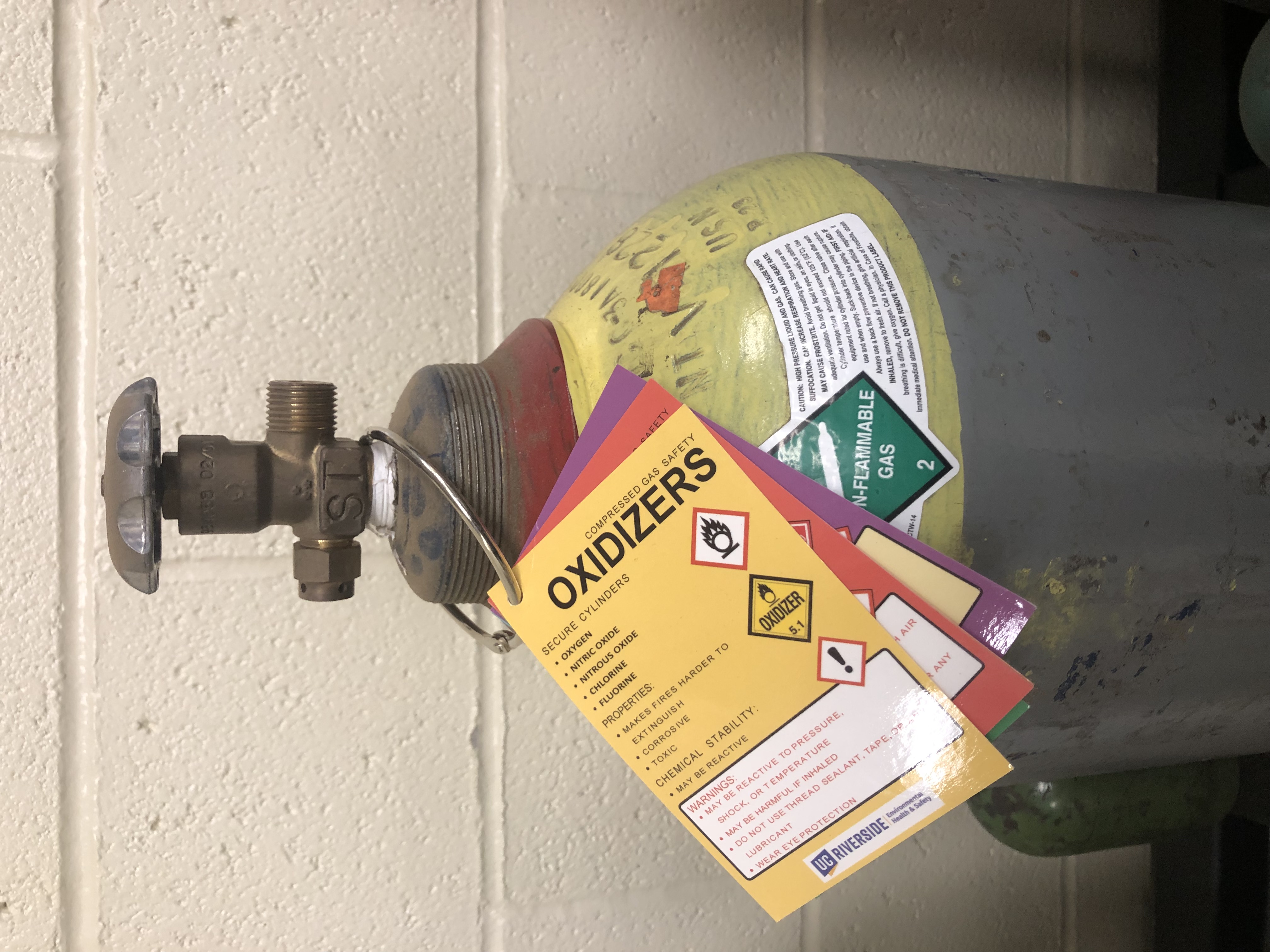 Compressed Gas Safety Cards shown hanging on tank neck