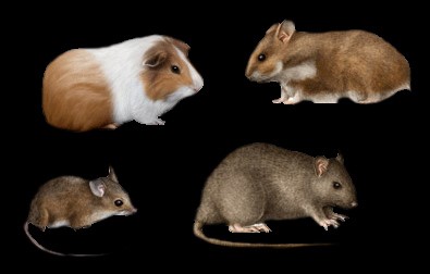 A group of four rodents displayed on a black background. In the top left is a brown-and-white guinea pig with a rounded body and short legs. To its right is a small golden-brown hamster with tiny ears and a short tail. In the bottom left is a small brown mouse with a slender body, large ears, and a long thin tail extending behind it. In the bottom right is a larger brown rat with a thicker body, darker fur, and a long tail stretched out on the ground.