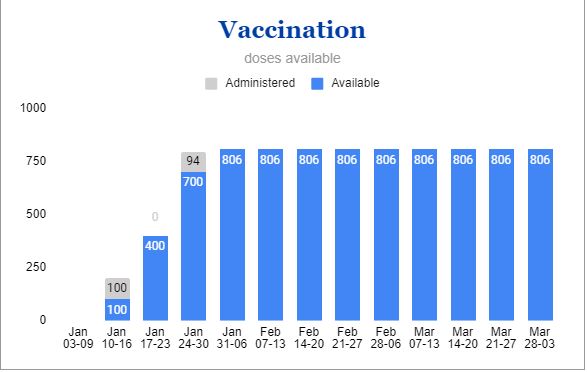 graph showing campus doses by week visually separated by # administered stacked on top of # available